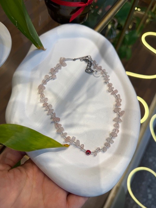 Collar hecho con escalas de piedra cuarzo rosa , Termianado con cadena de acero quirúrgico